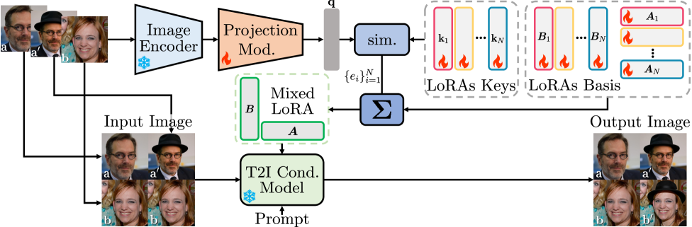 Figure 2: LoRWeB의 전체 아키텍처 개요. 입력 쌍의 관계를 인코딩하여 최적의 LoRA 조합 가중치를 계산하고 이를 모델에 주입하는 과정을 보여줍니다.