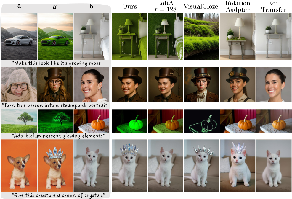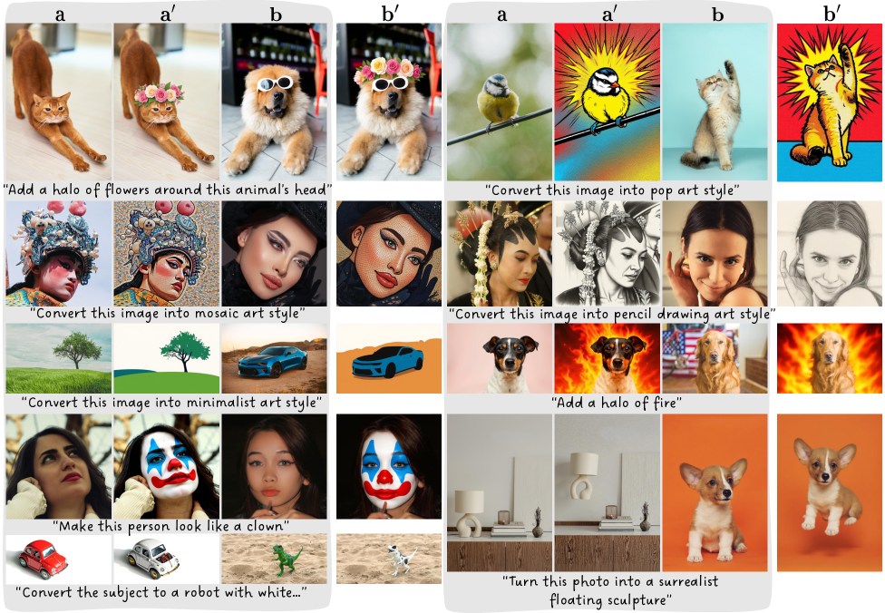 시각적 유추란 “$a$가 $a’$이 된 것처럼, $b$를 $b’$으로 바꾸어라($a : a’ :: b : b’$)”라는 지시를 AI가 수행하는 것을 의미합니다. 이는 인간에게는 매우 직관적인 작업이지만, 컴퓨터 비전 모델에게는 극도로 복잡한 문제입니다. 텍스트로 설명하기 힘든 미묘한 화풍의 변화, 사물의 기하학적 변형, 혹은 복합적인 속성(재질, 조명, 스타일)의 동시 전이를 포함하기 때문입니다.