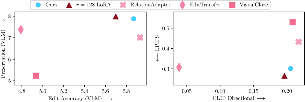 Figure 5: 정량적 지표 분석. LoRWeB은 편집 정확도와 이미지 보존력 사이의 파레토 최전선(Pareto Front)을 확장하며 두 마리 토끼를 모두 잡는 데 성공했습니다.