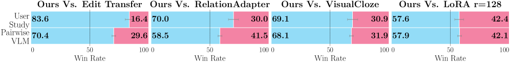 Figure 6: 사용자 및 VLM 기반 선호도 비교. 모든 지표에서 LoRWeB이 경쟁 모델을 압도하는 모습을 보입니다.