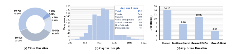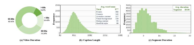 그림 3: TimeChatCap-42K 통계. 약 4.2만 개의 영상에 대해 평균 877단어의 상세 설명을 포함합니다.