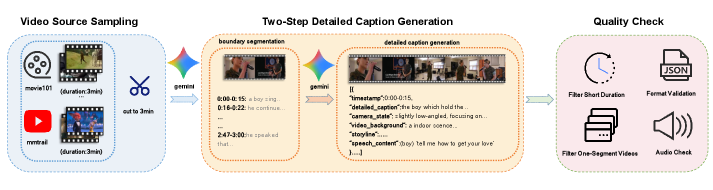 그림 4: 합성 데이터 생성 파이프라인. 원본 영상에서 메타데이터를 추출하고 구조적 캡션으로 변환하는 과정을 보여줍니다.