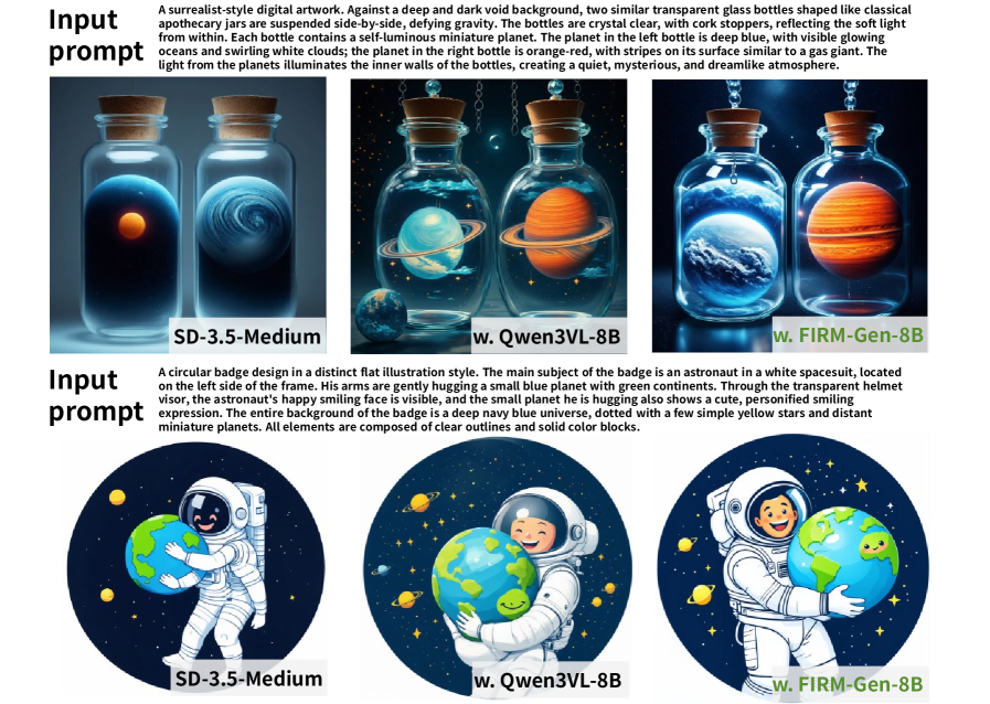 그림 2: 복잡한 다중 객체 프롬프트가 주어졌을 때, 타 모델들이 은근슬쩍 속성이나 객체를 빼먹고 렌더링하는 반면 FIRM-Gen-8B 기반의 모델은 지시사항을 악착같이 다 반영해 냅니다.