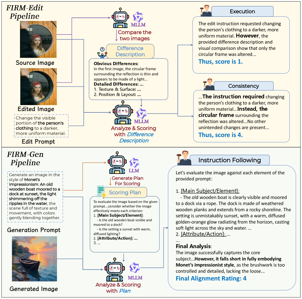 기존의 보상 모델들은 단순히 완성된 이미지를 던져주고 “이거 프롬프트랑 잘 맞아? 1~10점으로 평가해 봐”라고 묻는 원시적인 방식을 썼습니다. FIRM은 이 안일한 접근을 완전히 쪼개버립니다. 연구진은 ‘이미지 편집(Edit)’과 ‘이미지 생성(Gen)’의 평가 기준이 근본적으로 다르다는 걸 인지하고 파이프라인을 두 개로 분리했습니다.