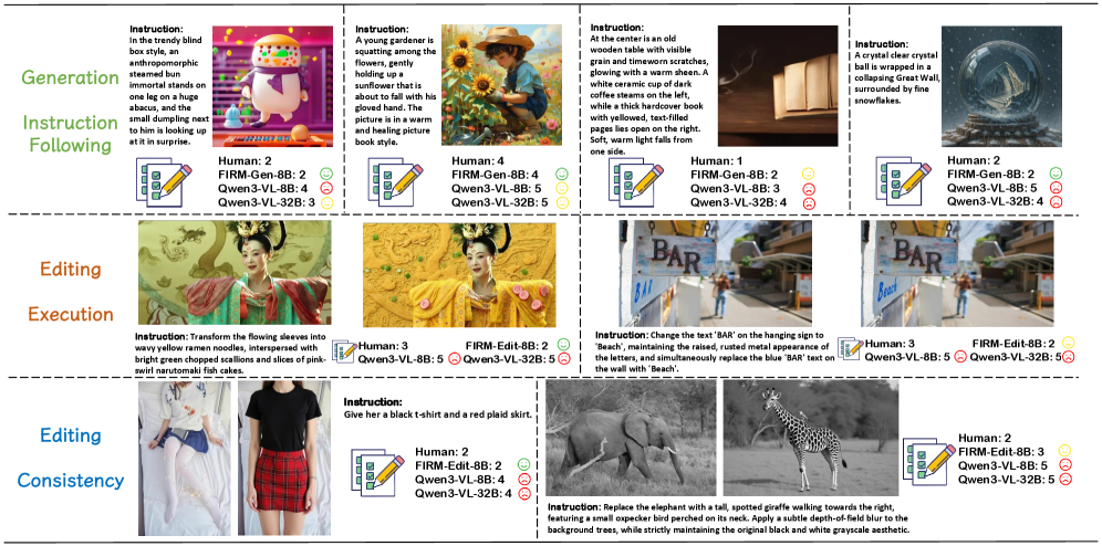 - Consistency (일관성): 건드리지 말아야 할 배경이나 나머지 요소들이 원본과 완벽하게 동일하게 유지되었는가? 이 논리적인 접근을 위해 37만 개의 고품질 데이터(FIRM-Edit-370K)를 구축해 FIRM-Edit-8B 모델을 깎아냈습니다.
