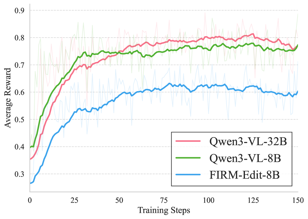 그림 5: 타 보상 모델(주황색, 보라색 선)들이 RL 학습을 거듭할수록 오히려 보상이 곤두박질치거나 요동치는 반면, FIRM-Edit-8B를 Critic으로 쓴 곡선(파란색)은 안정적으로 우상향하는 것을 볼 수 있습니다. 제대로 된 평가 지표가 강화학습에서 얼마나 중요한지 보여주는 증거입니다.