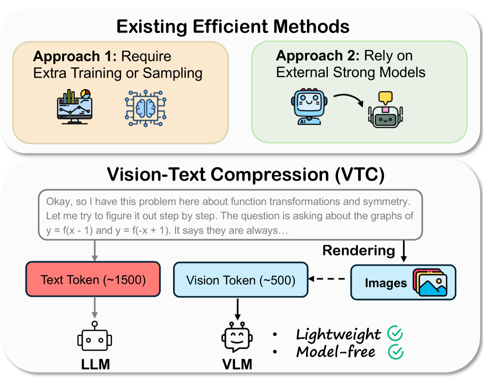 그림 1: 기존의 복잡한 압축 방식들과 달리, VTC는 가벼운 렌더링을 통해 텍스트를 이미지로 변환하여 모델 프리(Model-free)한 방식으로 고효율 압축을 달성합니다.