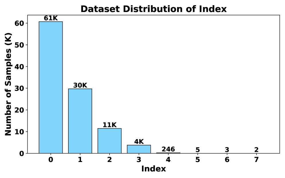 그림 3: 데이터 인덱스 분포. 대부분의 추론은 초기 단계에서 완료되지만, 복잡한 문제일수록 다단계의 이미지-텍스트 피드백 루프가 생성됨을 알 수 있습니다.