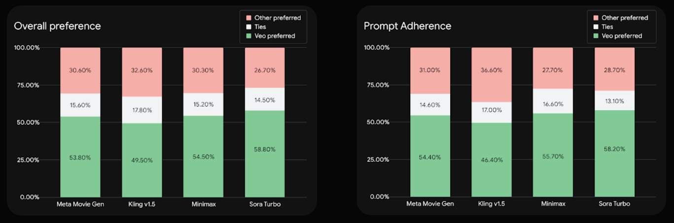 DeepMind는 Veo 2의 성능을 인간 평가자들이 참여한 MovieGenBench 벤치마크를 통해 검증했습니다.