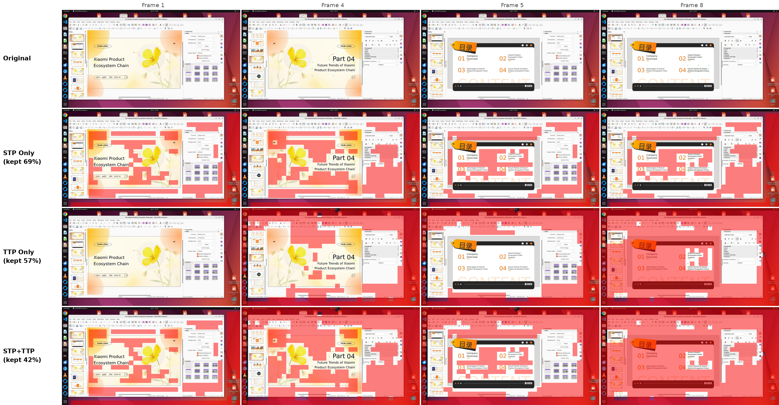 STP 기법이 어떻게 화면의 정적인 부분은 날리고 의미 있는 변화(UI 상호작용)에만 집중하는지 보여줍니다. 이 덕분에 8B 모델임에도 긴 비디오를 메모리 터지지 않고 처리할 수 있습니다.