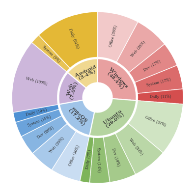 ExeVR-53k 데이터셋의 분포입니다. 운영체제를 가리지 않고 범용적인 에이전트 평가가 가능하도록 설계되었습니다.