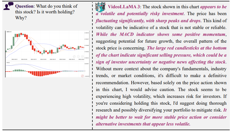 📌 VideoLLaMA 3의 답변: “해당 주식은 변동성이 크고 투자 위험이 높아 보입니다.”