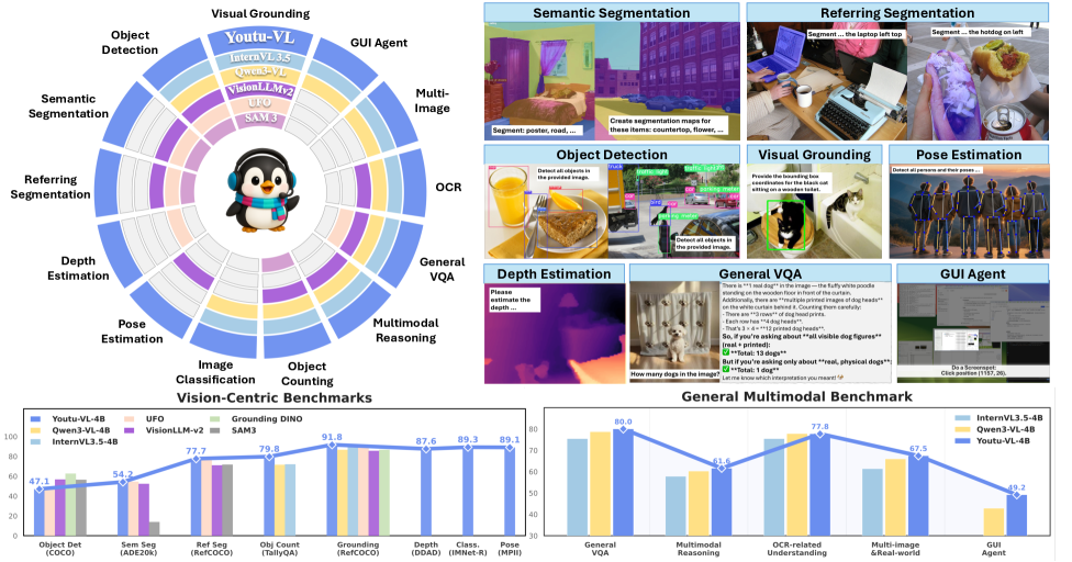 Figure 1:Youtu-VL achieves competitive performance on both general multimodal tasks and vision-centric tasks.The concentric rings illustrate the capability scope of different models across various tasks. Colored regions indicate that the model supports the corresponding task, while white regions denote a lack of support. Unlike prior models that exhibit functional gaps, Youtu-VL accommodates a comprehensive range of vision-centric and multimodal tasks via a standard architecture, achieving competitive performance without relying on task-specific modules.
