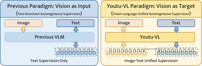 Figure 2:Comparison between the previous ”vision as input” paradigm and the Youtu-VL ”vision as target” paradigm.The left panel shows the previous text-dominant VLM, which relies solely on text supervision. The right panel illustrates the Youtu-VL paradigm, which incorporates Vision-Language Unified Autoregressive Supervision (VLUAS), treating vision as a target to achieve unified supervision for both image and text.