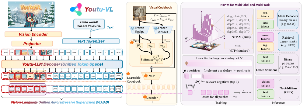 Figure 3:Overview of the Youtu-VL Framework.Left: The architecture integrates a Vision Encoder and Youtu-LLM via a Spatial Merge Projector, operating under the proposed VLUAS paradigm for unified autoregressive modeling. Middle: The Synergistic Vision Tokenizer. We construct a unified vocabulary by fusing semantic and geometric features via cross-attention, optimized with perception and adversarial losses. Right: Dense prediction mechanism. Our proposed NTP-M enables robust multi-label supervision with a relevant negative sampling. Unlike conventional approaches, Youtu-VL achieves direct dense prediction without auxiliary decoders or task-specific tokens.