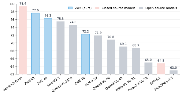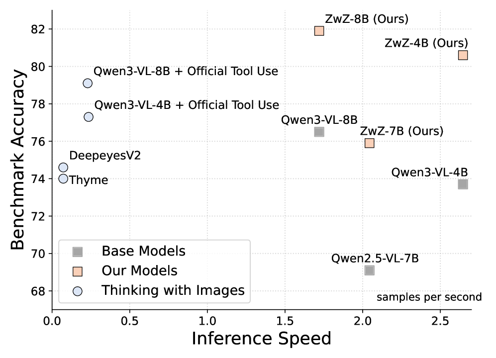 가장 놀라운 결과는 ZwZ 모델이 추론 시 툴을 사용하여 여러 번 이미지를 확인하는 에이전트 모델(Agentic MLLMs)보다 더 높은 성능을 보였다는 점입니다.