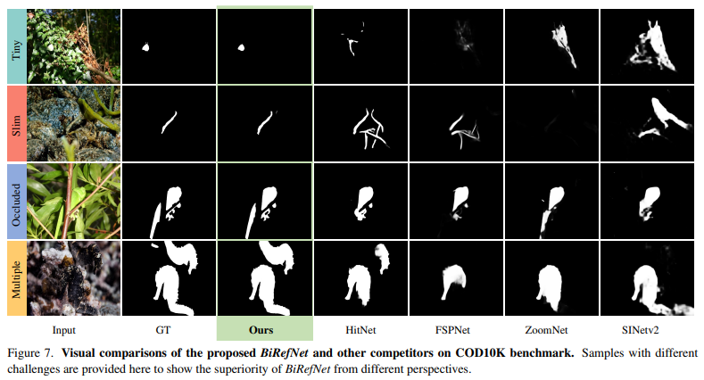 BiRefNet은 HRSOD에서 기존 SOTA 대비 2.0% Sm 향상을 달성했으며, 특히 작은 객체와 복잡한 배경에서의 분할 성능이 뛰어납니다.