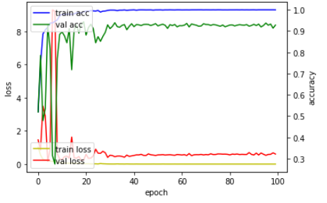 학습을 진행한다. Colab의 GPU를 이용하기 때문에 꽤 빠르다. epoch수를 줄여도 꽤 좋은 결과가 나올 것이다.