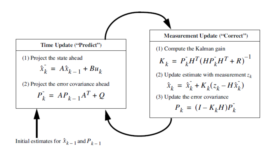 위에 내용들을 종합해 보면 측정 잡음을 포함하는 입력을 노이즈가 제거된 정확한값으로 다음 상태를 확률적으로 추정하는 알고리즘입니다. kalman filter는 상태 예측(state prediction)과 측정 업데이트(measurement update)를 재귀적 으로 현재상태를 계산한다. 상태 예측에서는 이전 상태의 값의 확률분포와 입력의 확률분포를 통해 현재 값을 예측하고, 측정 업데이트는 상태 예측단계에서 예측한 현재 값 그리고 실제 현재 값을 이용해 값을 갱신하는 알고리즘이다.