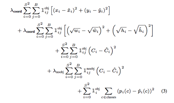 x ,y ,w ,hi: Object가 존재하는grid cellj: predictor bounding box1(i,obj): grid cell에 Object가 있을 때1(ij,obj): 셀 i에 있는 j(bounding box)λcoord: 5λnoobj: 0.5λcoord: coordinates(x,y,w,h)에 대한 loss와 다른 loss들과의 균형을 위한 balancing parameter.λnoobj: object가 있는 box와 없는 box간에 균형을 위한 balancing parameter. (일반적으로 image내에는 object가 있는 cell보다는 object가 없는 cell이 훨씬 많기 때문)